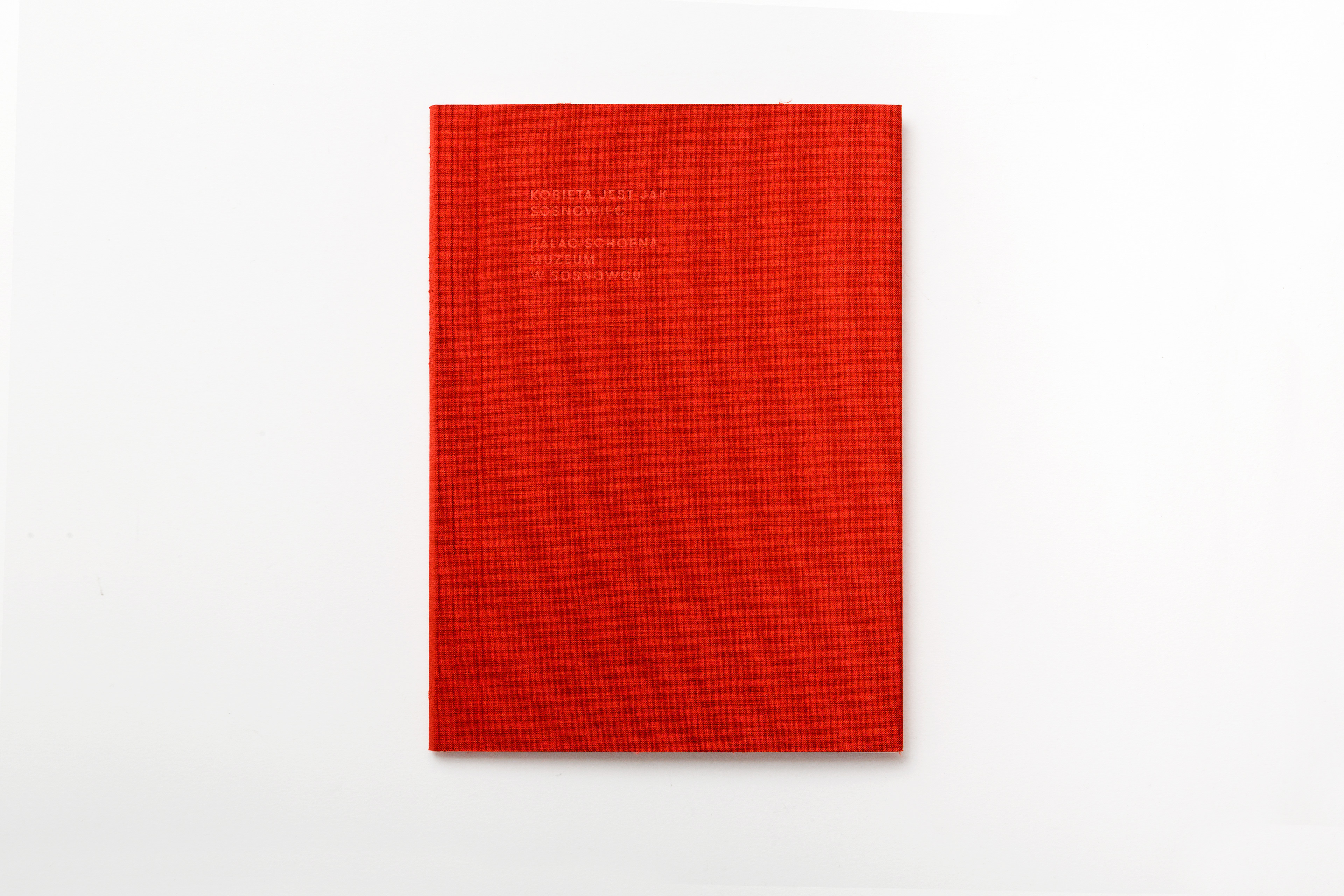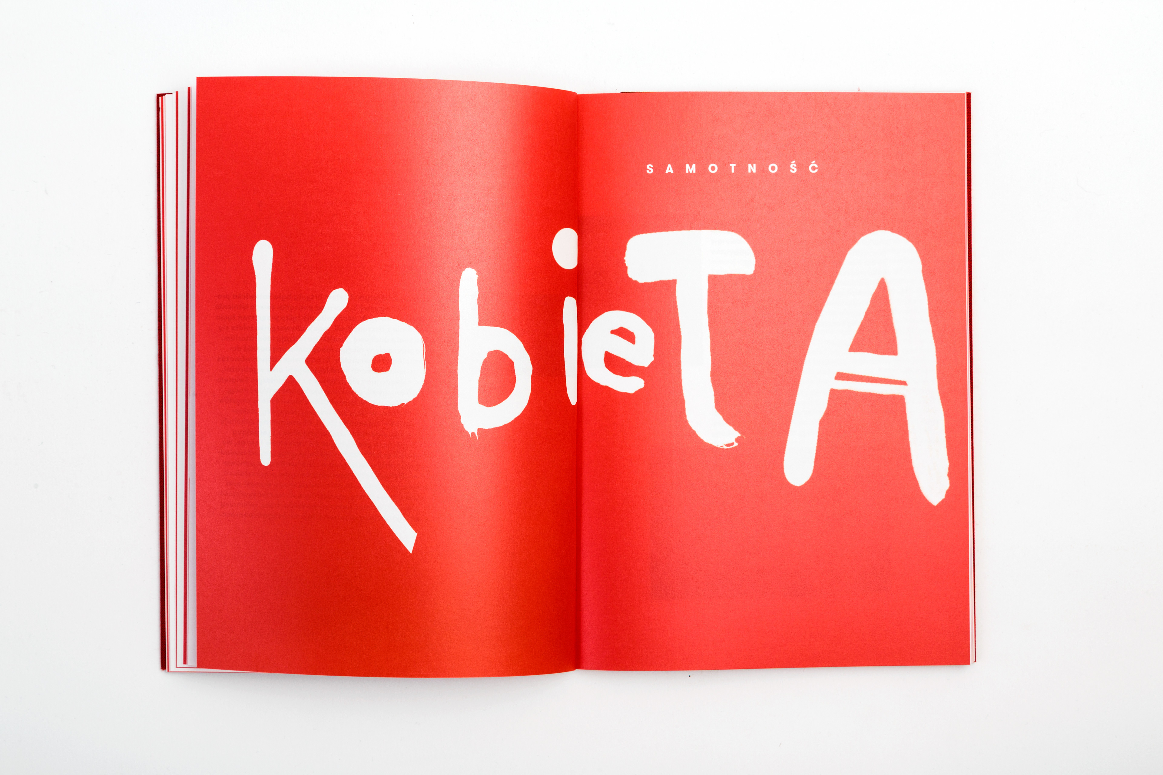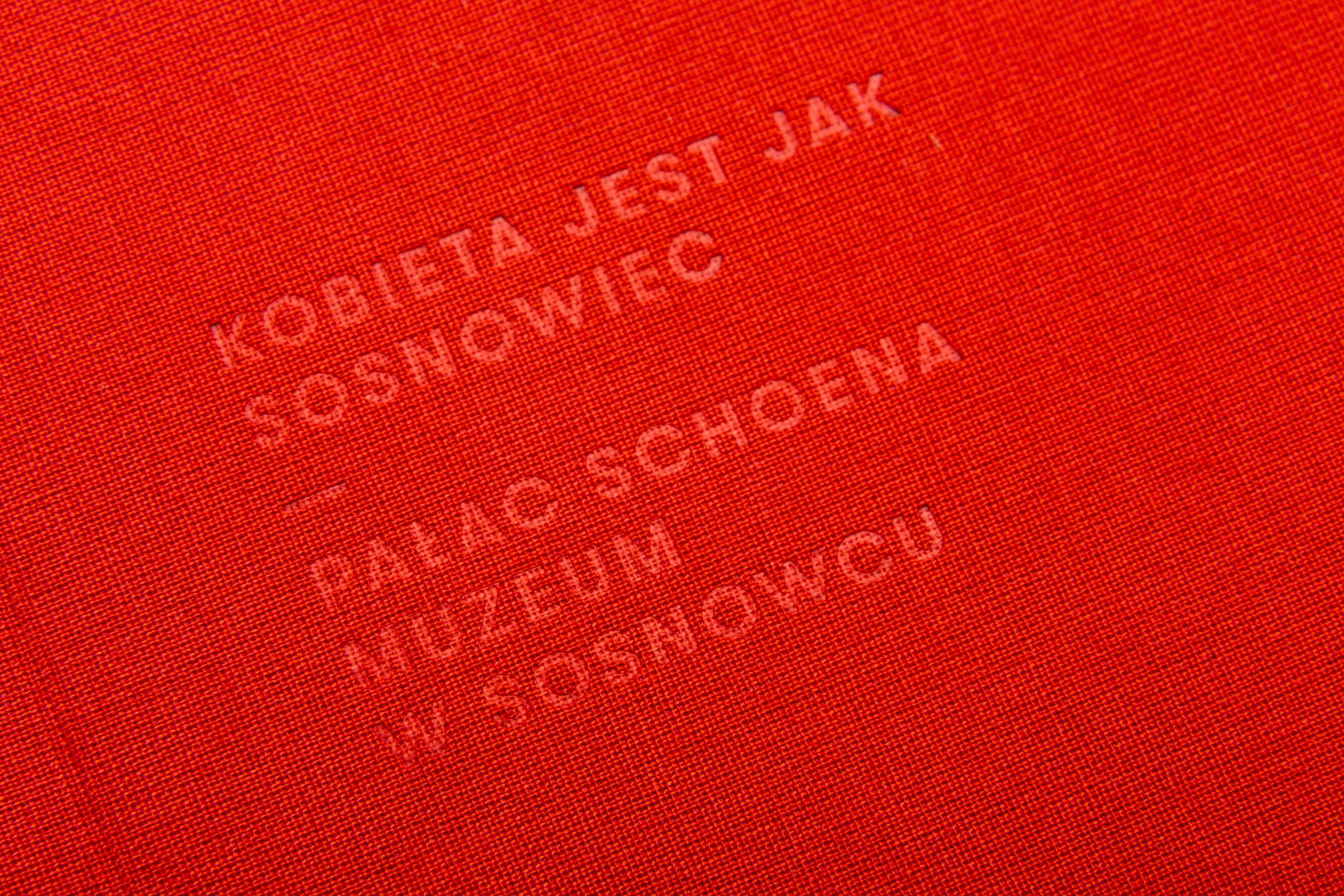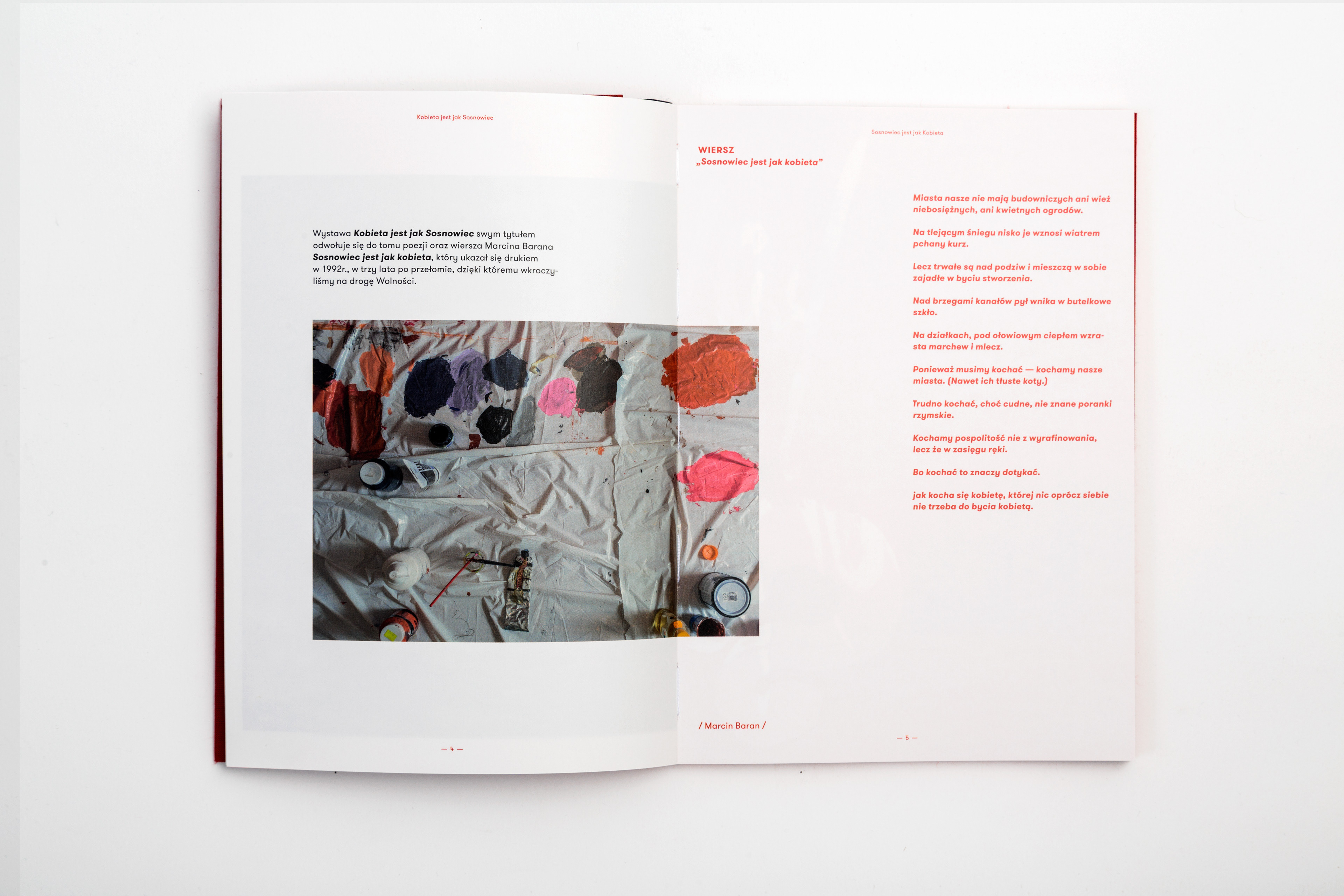 The catalogue published in case of the exhibition presenting works of several artists connected with the city of Sosnowiec. The title of the exhibition translated into english sounds "Woman is like Sosnowiec", which refers to a poem of Marcin Baran. The poem treats about the city, that is loved in spite of being very ordinary. This love however, like a woman, has many faces. That's why word "kobieta" (eng. woman) were written with different graphical expressions, pasted white on red paper and used as chapter pages.