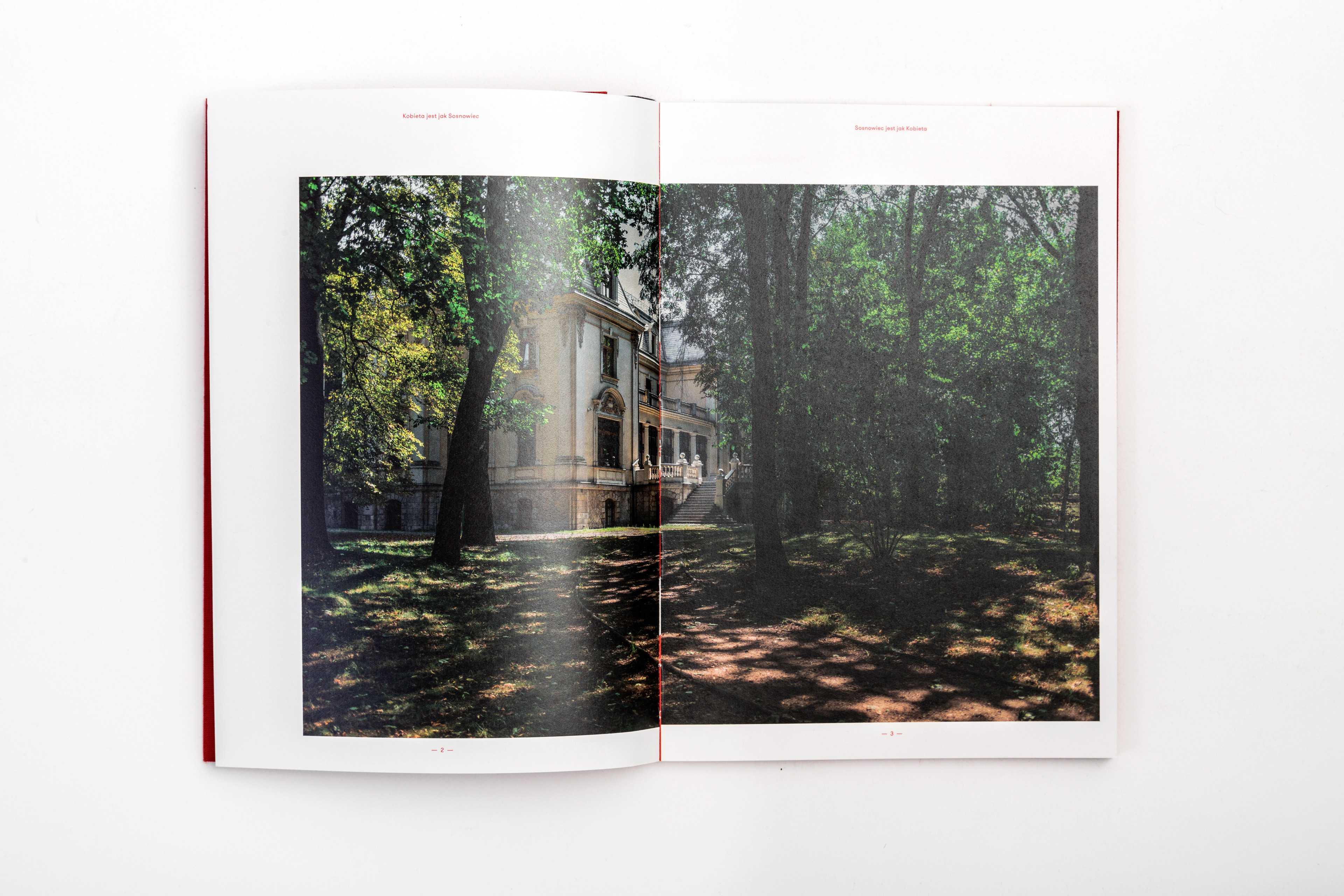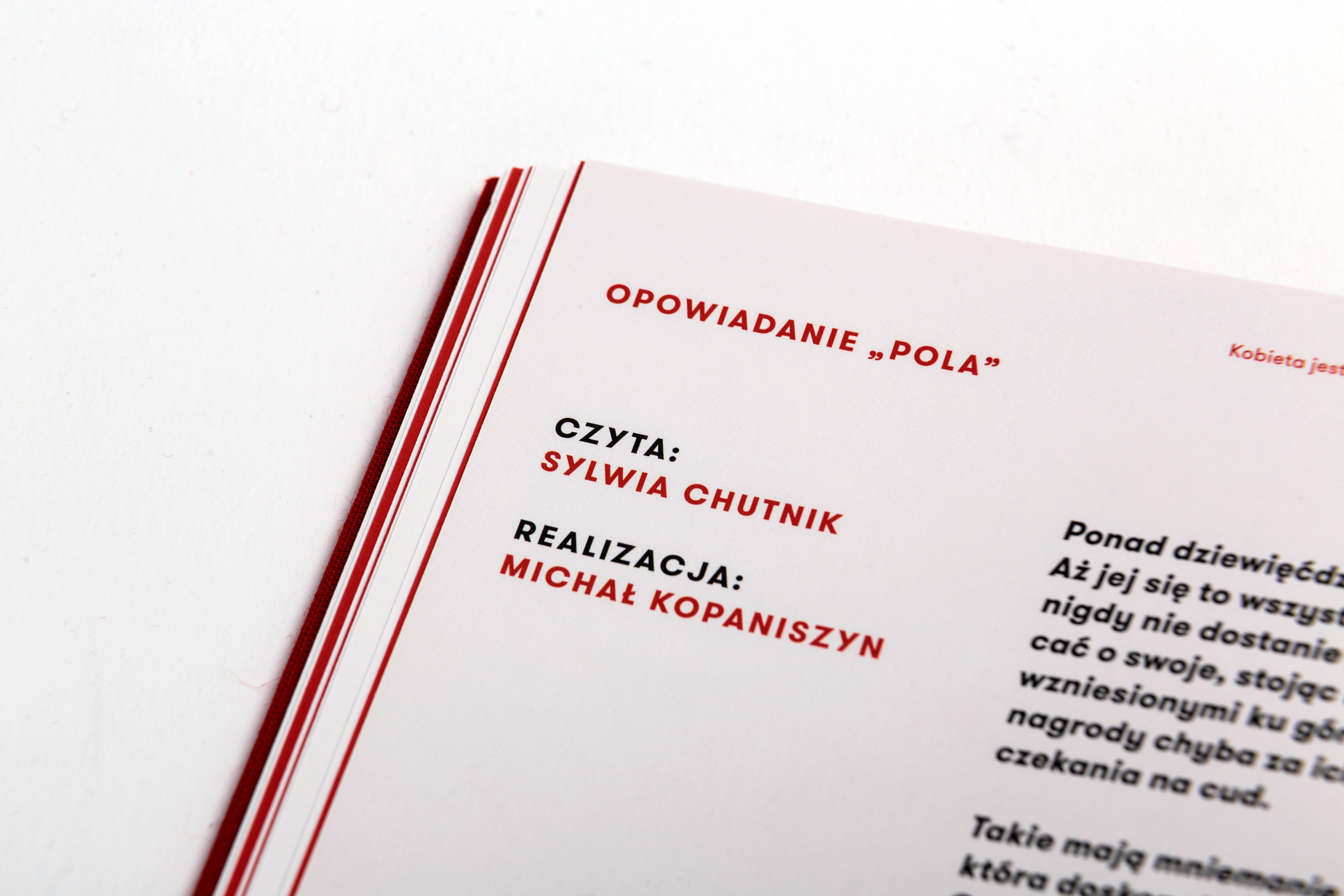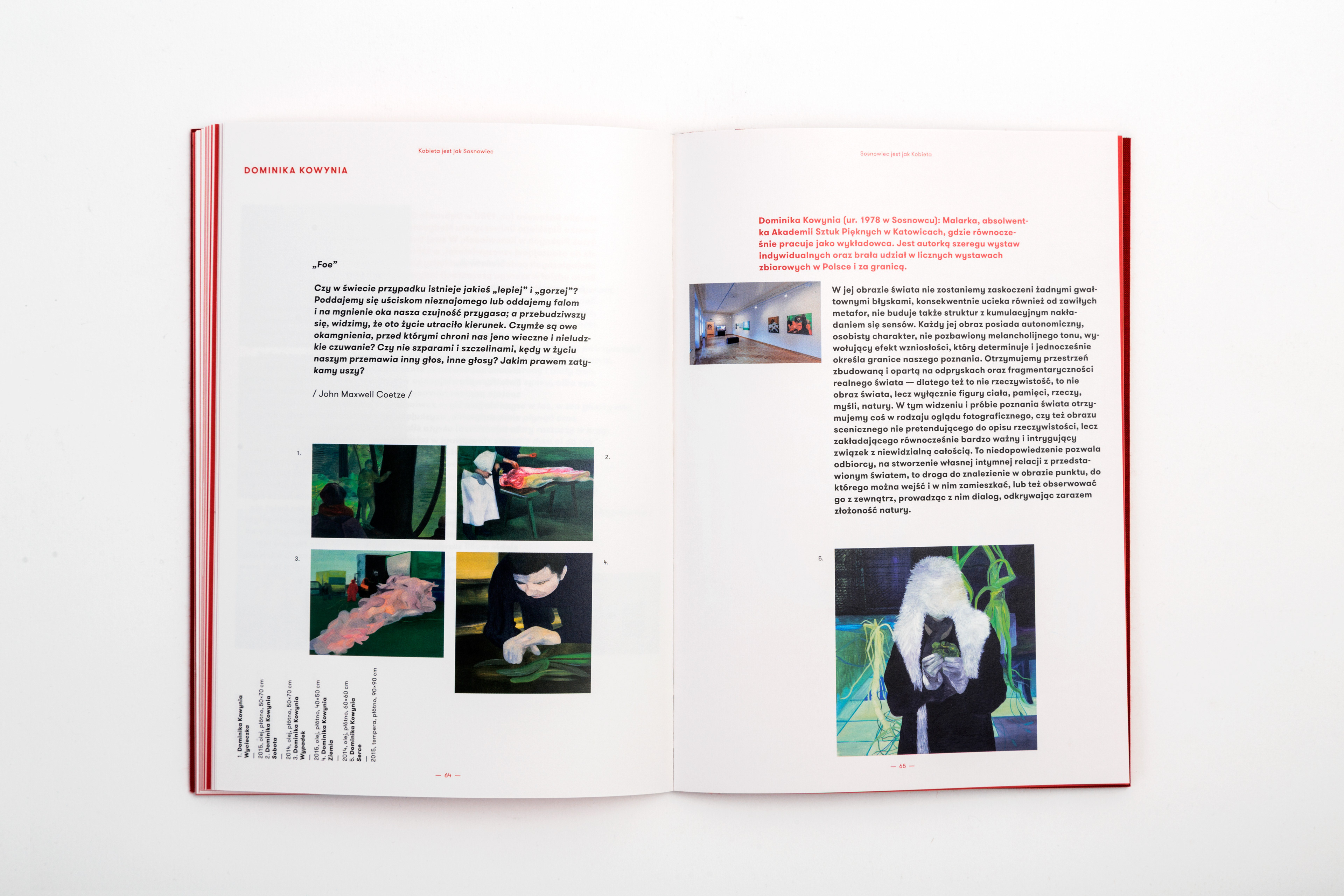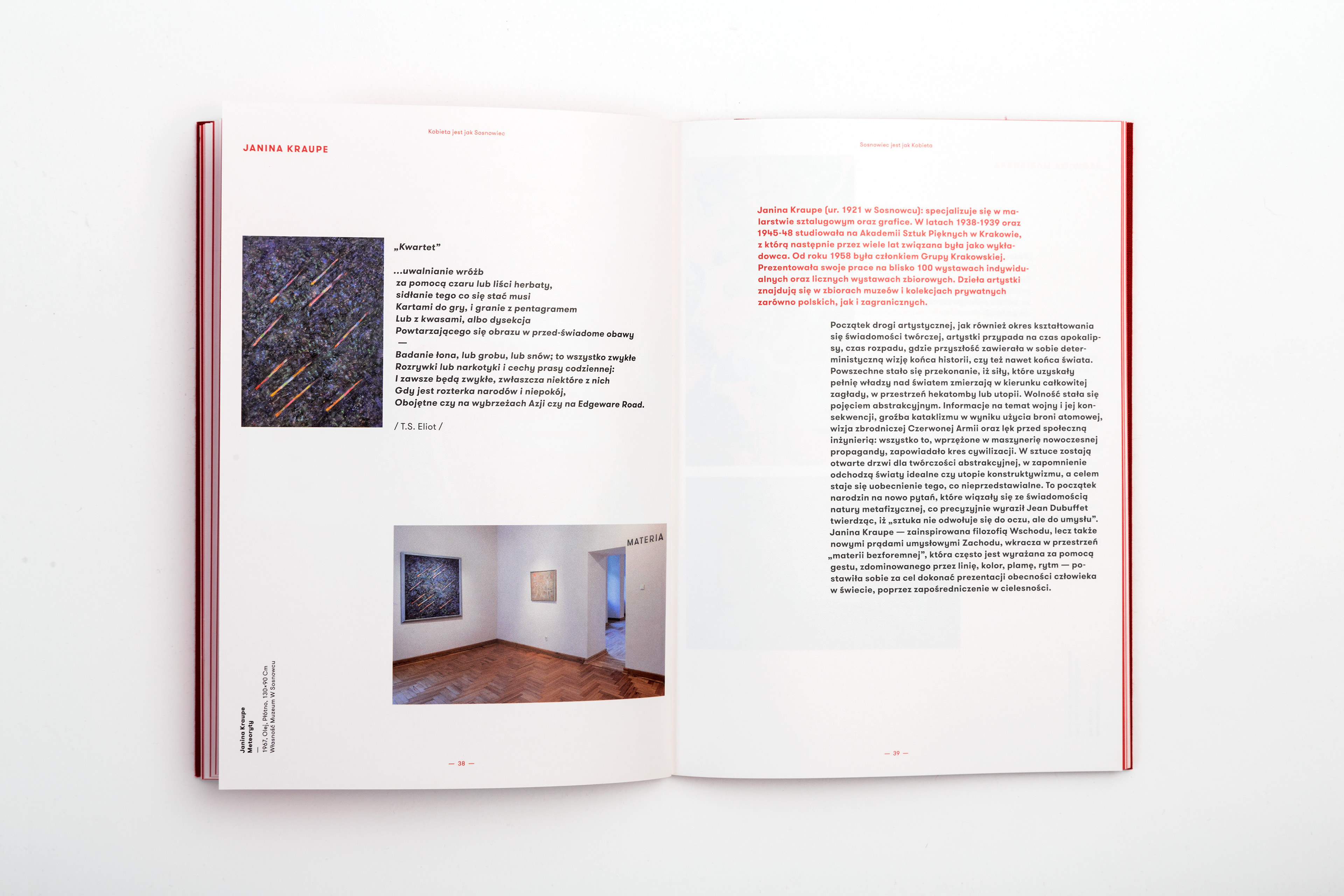 The catalogue published in case of the exhibition presenting works of several artists connected with the city of Sosnowiec. The title of the exhibition translated into english sounds "Woman is like Sosnowiec", which refers to a poem of Marcin Baran. The poem treats about the city, that is loved in spite of being very ordinary. This love however, like a woman, has many faces. That's why word "kobieta" (eng. woman) were written with different graphical expressions, pasted white on red paper and used as chapter pages.