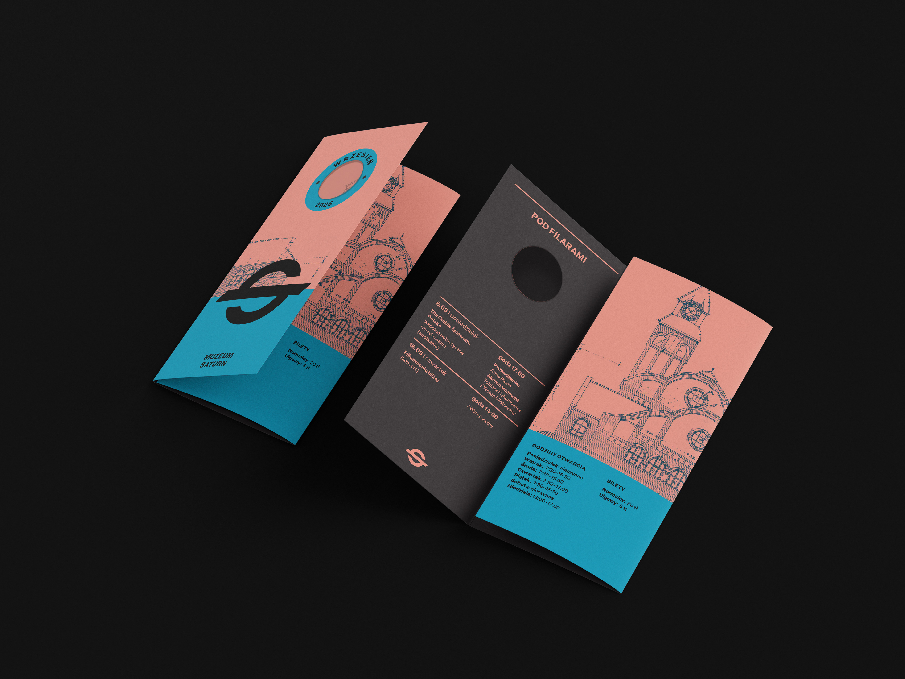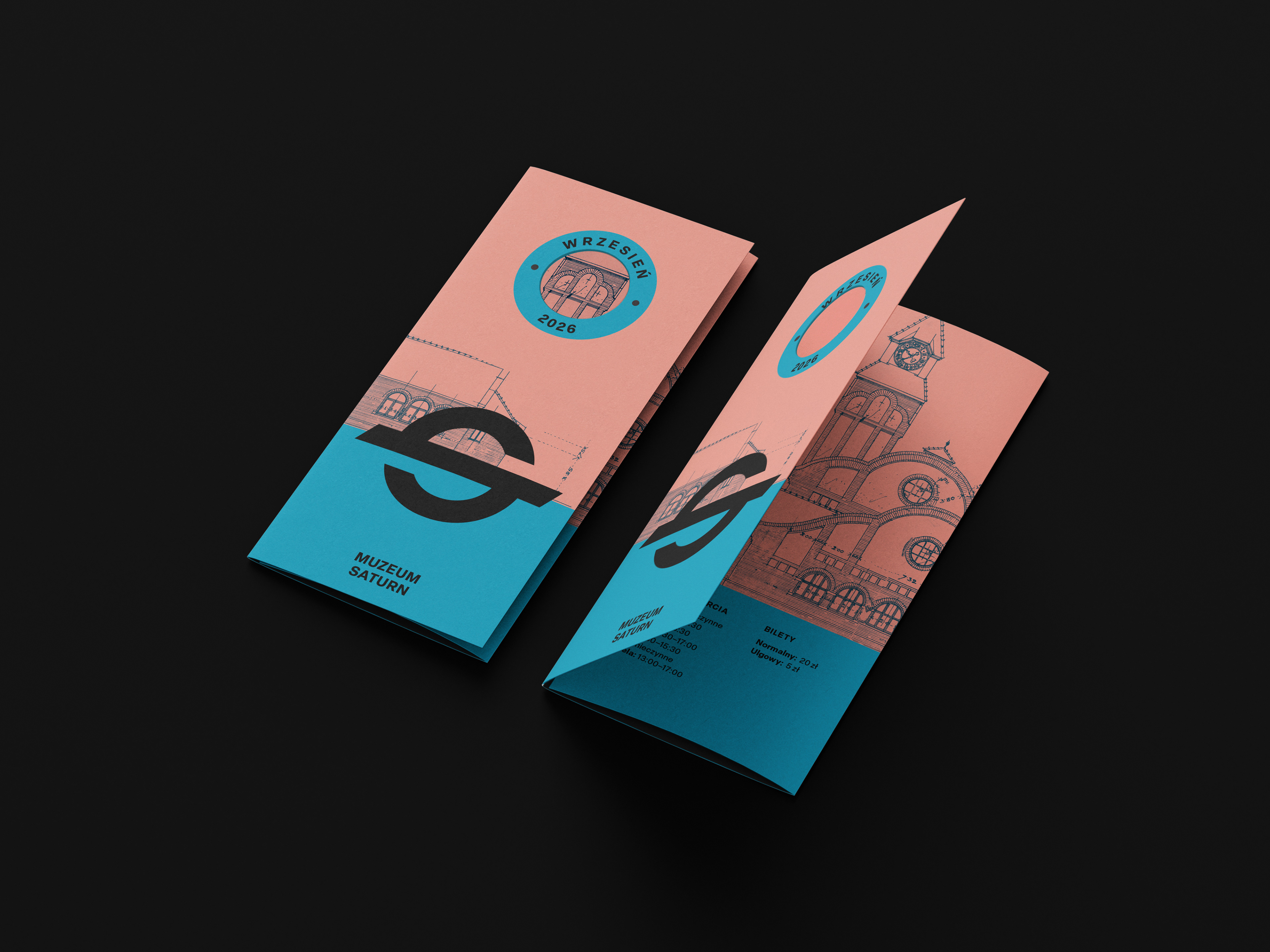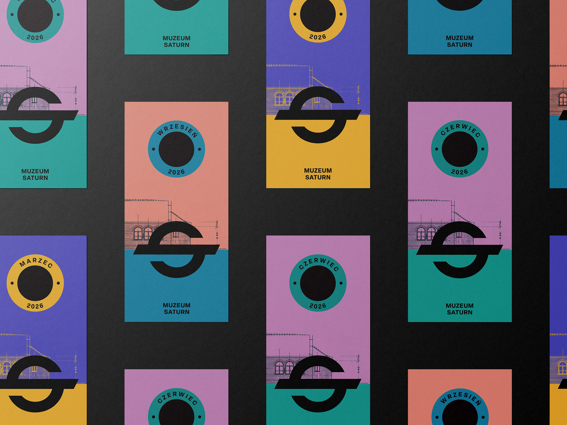 Design for the Saturn Museum in Czeladź, whose name is derived from the tradition of the former Saturn Mining and Industrial Society. The logo is inspired by the society’s historical emblem and serves as the foundation for the museum’s visual identity. The industrial character refers to the site’s heritage, while the modern form reflects the contemporary spirit of the institution. Bold colors are designed to stand out against the post-industrial surroundings.